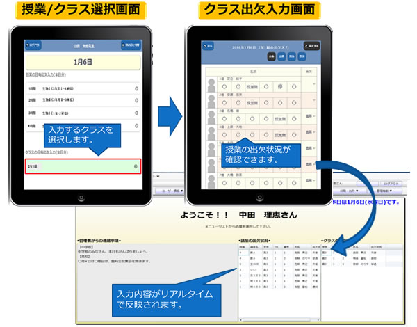 - 教室からiPadなどのタブレット端末で出欠情報を入力できます。